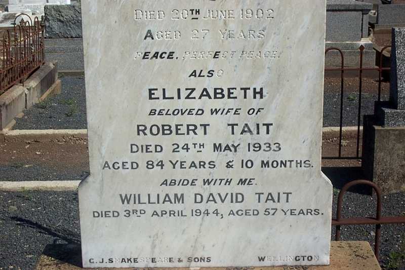 William passed away on April 3rd 1944 at the age of 57. He is buried in the Wellington General Cemetery in the Methodist section along with both of his parents Robert & Elizabeth, and his sister Isabella Sherriff Tait who had passed away in 1902.