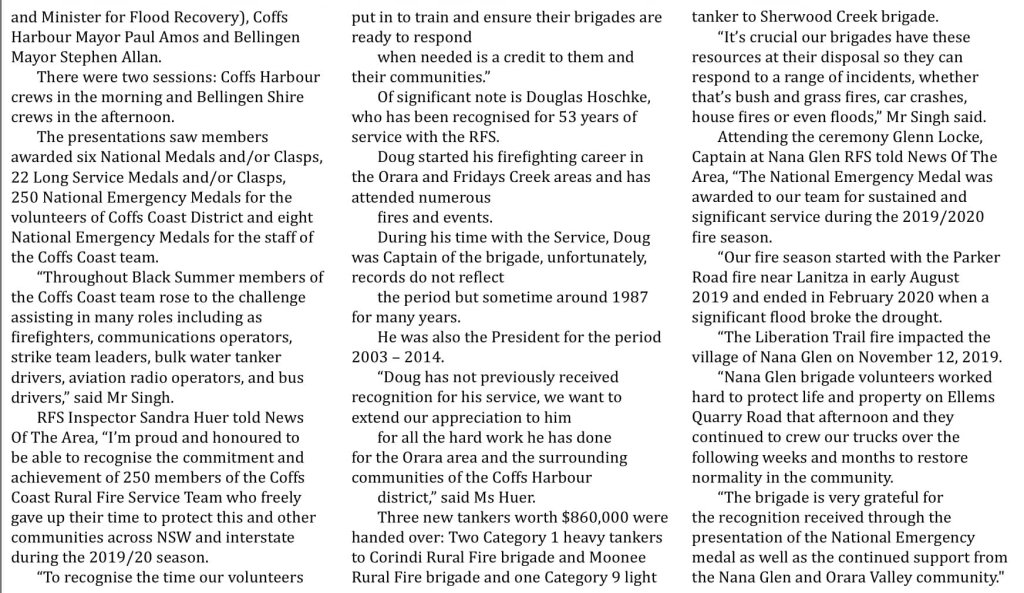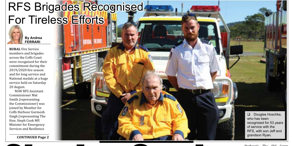 Wonderful recognition for 250 members of the NSW RFS – Coffs Coast Team – Coffs and Bellingen team for their efforts during the 2019 / 2020 season, with special recognition for Doug Hoschke for 53 years of service 🙏🏽 lovely photo of Doug, Geoff Hoschke and Ryan Hoschke. Read the full article here: https://issuu.com/newsofthearea/docs/coffs_coast_news_of_the_area_26_august_2022