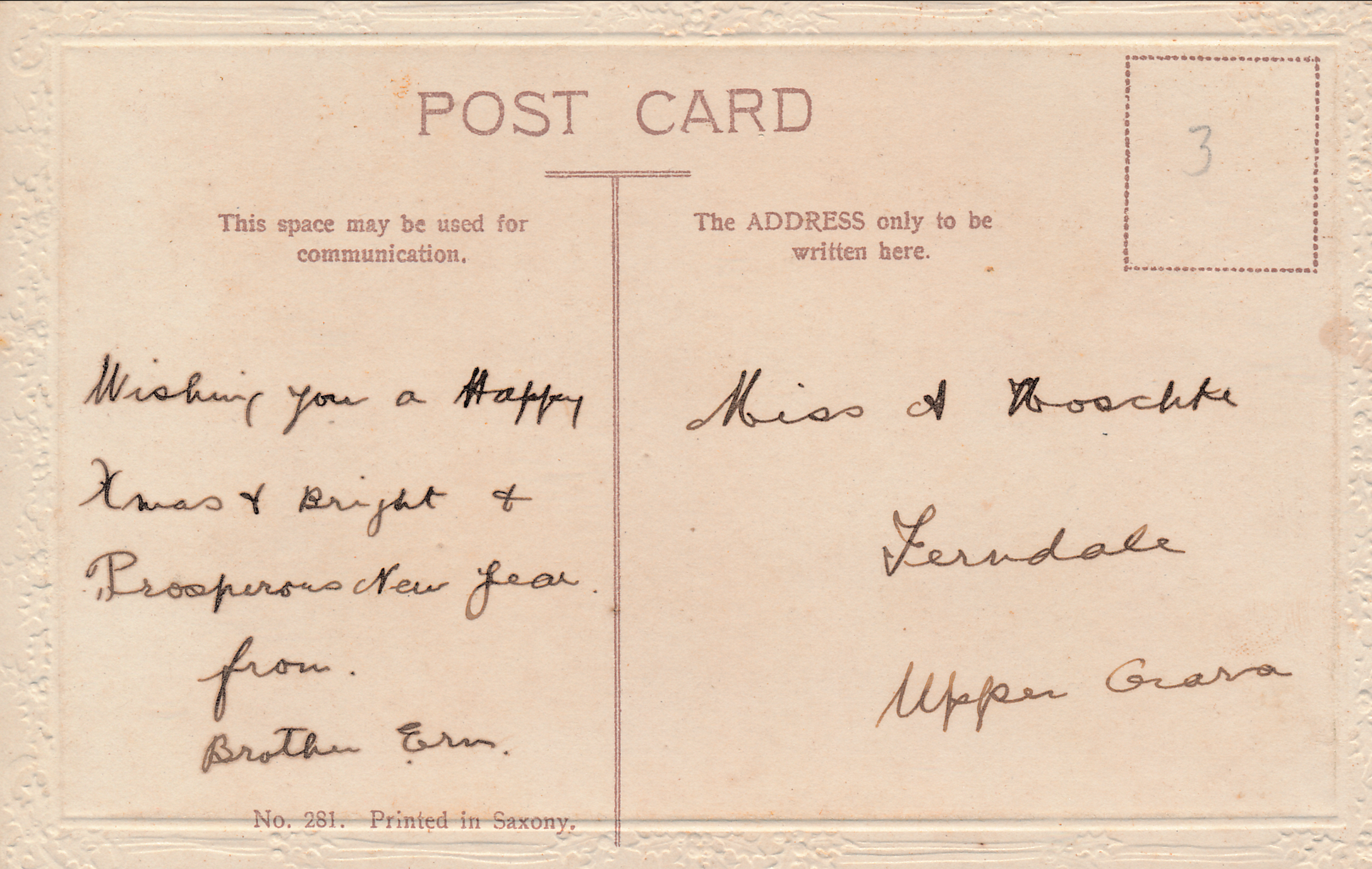 We would like to share with you some Christmas cards from times past, each one a nod to the connections we have made this year. Firstly, a Christmas wish to Amandus from his brother Karl in Germany back in 1898. This is in recognition of the connections we have made back to Germany this year. In 2024 we made contact with the family of Hans Ulrich Hoschke, a cousin from Germany. This has been a particular joy as it continues the communication that Amandus shared with the family who remained in the homeland.