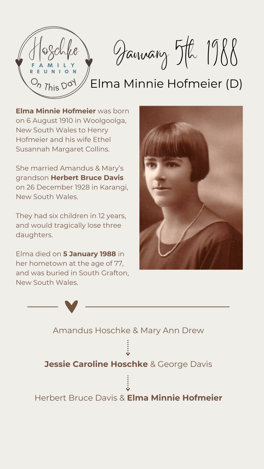 Elma Minnie Hofmeier met Amandus and Mary’s grandson Bert Davis when her parents were living and working in Karangi. After a full and wonderful life, Elma passed away on this day in 1988, aged 77. You can read more of Elma’s life story here, with thanks to Pat Davis and Bruce Davis.