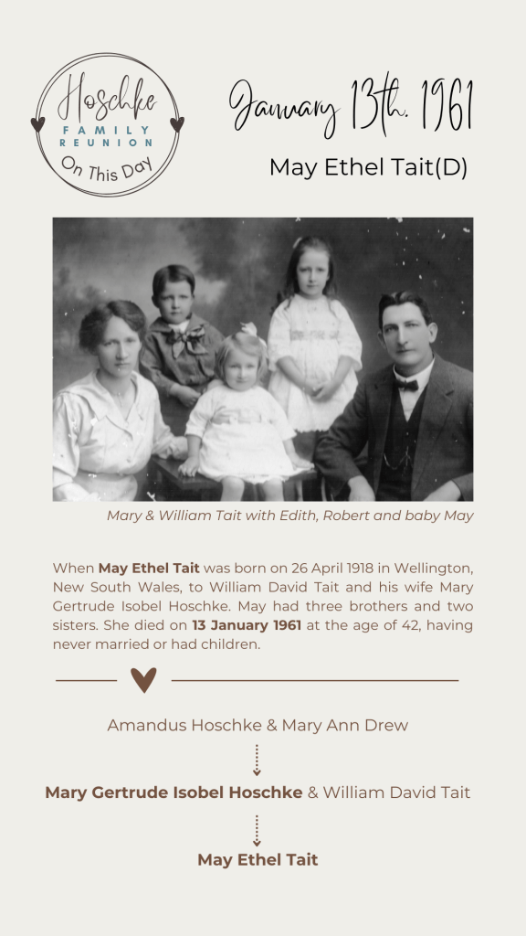 May Ethel Tait was born to Amandus and Mary’s second youngest daughter Mary and her husband William David Tait. Mary suffered from asthma, and was sent to live with her maternal grandparents in Orange, which was a drier climate, at around 12 years of age and she remained in that area for the rest of her life.