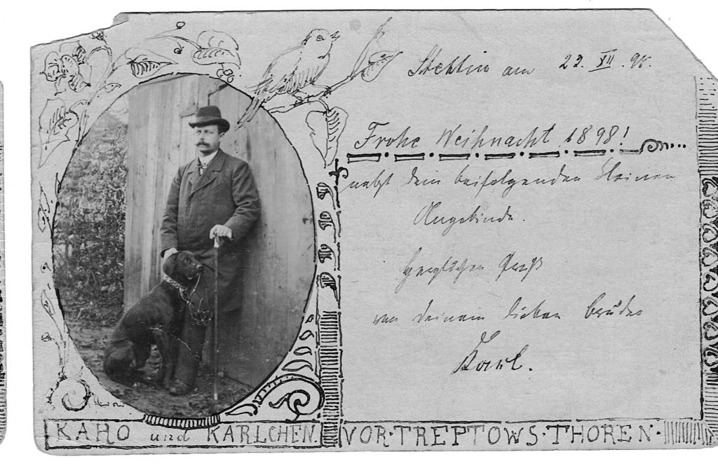 A translation of the words is ‘Stettin, Dec. 22[23] 98 / Merry Christmas 1898! / together with the following small favour [something attached] / Kind regards / from your dear brother / Karl.’