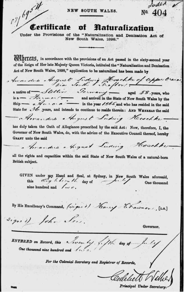 - His naturalization document is a New South Wales document as Australia did not exist until the colonies federated in 1901. So, it fits that he did arrive in the colony of NSW on the Aurora from Brisbane in the colony of Queensland. Then the question is how he got to Brisbane.