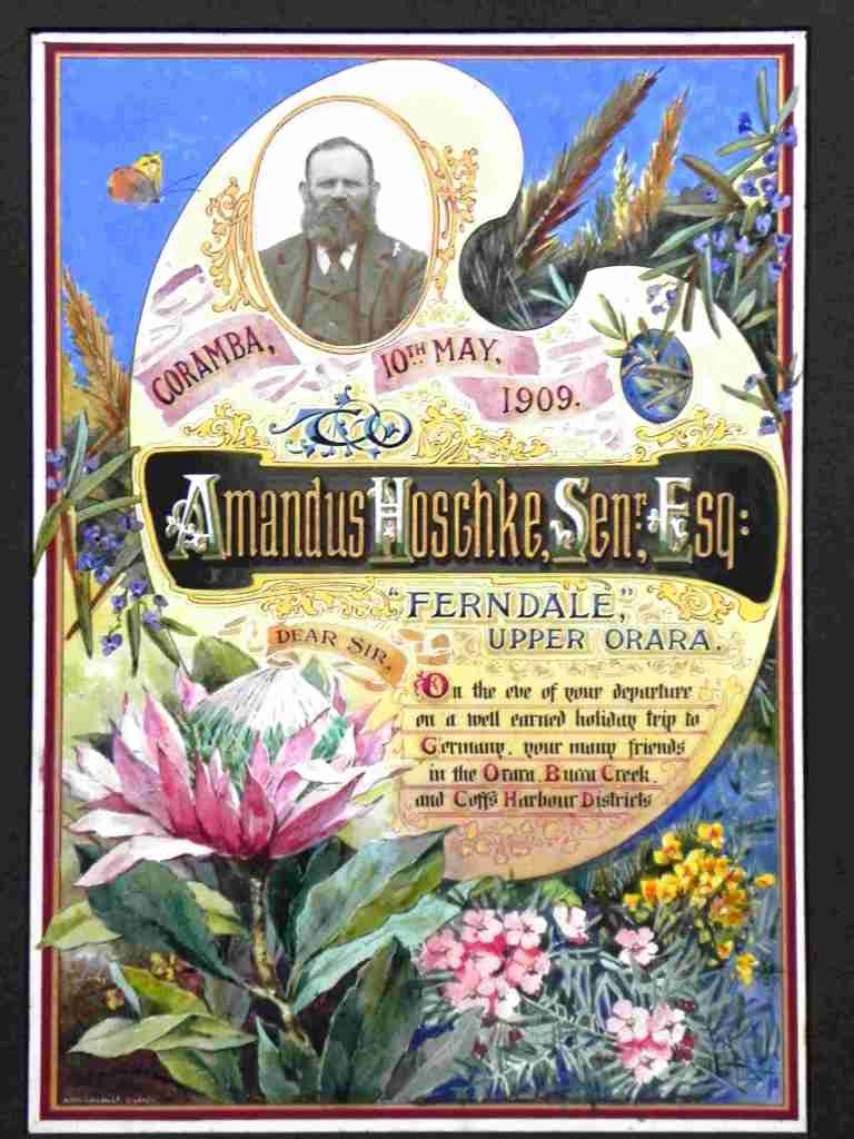 On the eve of your departure on a well earned trip to Germany, your many friends in the Orara, Bucca Creek and Coffs Harbour Districts are desirous of showing some slight recognition of the excellent services you have at all times rendered for the progress and welfare of the community generally.
