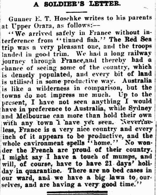 Gunner E. T. Hoschke writes to his parents-at Upper Orara, as follows:— “We arrived safely in France without interference from “tinned fish.” The Red Sea trip was a very pleasant one, and the troops landed in good trim. We had a long railway journey through France, and thereby had a chance of seeing some of the country, which is densely populated, and every bit of land is utilised in some productive way.