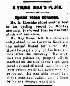 Mr. Roy Moses left his horse and sulky standing on Coramba Road and the animal bolted for home. Mr. Hoschke came along on his bike and took after the runaway. He overtook and passed it, jumped off the machine on the side of the road, then raced out and climbed into the sulky from behind while the horse was still galloping. He was able to get hold of the reins and pulled up the horse before any damage was done.