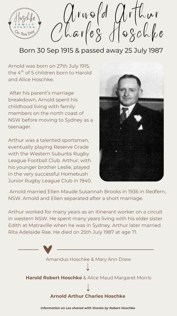 Arnold Arthur Charles HOSCHKE was born on 27 Jul 1915 and died on 25 Jul 1987 in Late Of Enmore, Nsw, at age 71. Arnold married Ellen Maude Susanah BROOKS in 1936 in Redfern, Nsw. Share this:ShareTweet Click to email a link to a friend (Opens in new window) Email Like Loading...