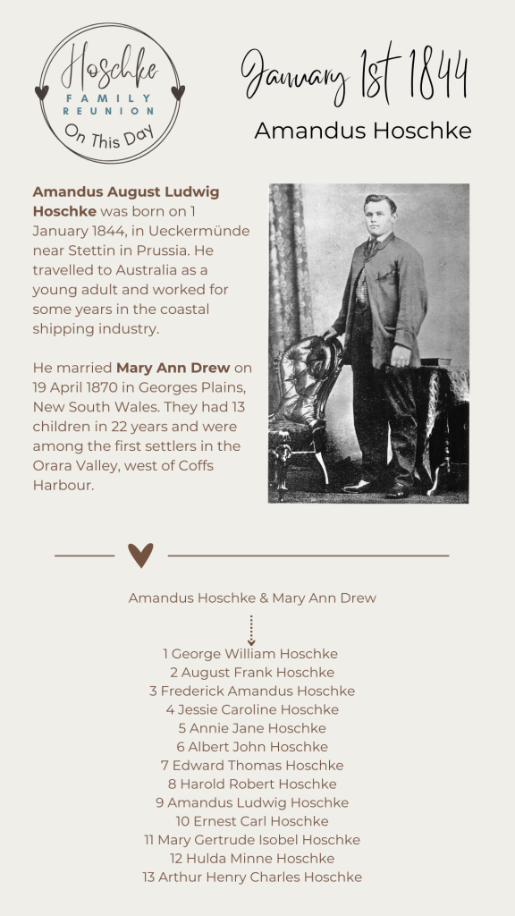 On This Day Amandus Hoschke born January 1, 1844 January 1, 2025 HoschkeFamilyReunion Leave a comment Amandus was born on this day in 1844. You can read more on Amandus’ life here – Amandus Hoschke Stories
