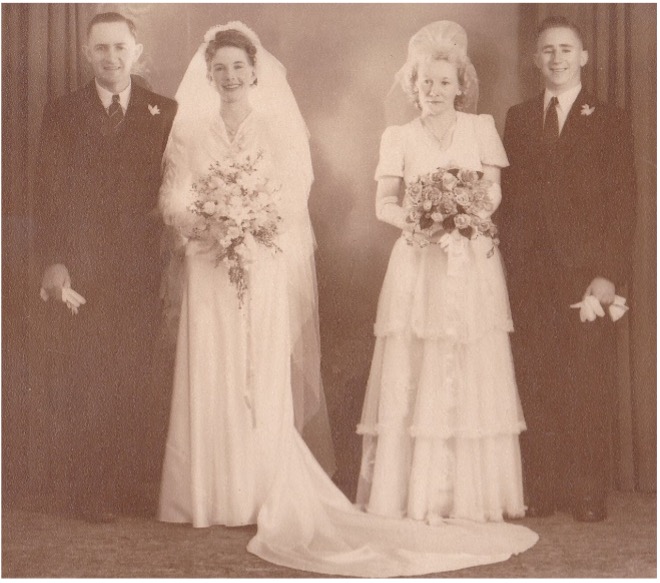 The bride made a lovely picture as she entered the Cathedral on the arm of her father. Her lovely white frock of bridal satin was cut on classical lines, featuring extended sheath bodice, with draped neck line and full-length shirred sleeves. The flared skirt flowed into a long graceful train. Her full length cut tulle veil was loaned by her aunt, Mrs T Gear, and was held in place by a wreath of orange blossom buds. She added a gold locket, which was worn by her mother on her wedding day and carried a shower bouquet of Eucharist Lilles, azaleas, carnations and pale pink boronia tied with white satin streamers. Miss Hazel Thompson, cousin of the bride, attended as bridesmaid and wore an old-world frock of white lace and net. The full three-tiered skirt was trimmed with tiny pale pink ribbon bows. Her short tulle veil was finished by a wreath of pale pink rosebuds. Accessories included full length white kid gloves, while her bouquet was of pink roses and camellias. Mr Bruce Davis of Woolgoolga carried out the duties of best man. The cathedral organist presided at the organ and during the signing of the register, Mr Verdan Gillet, cousin of the bride, sang “O Promise Me”. The reception was held at Skemts (hard to read) where the guests were received by the bride’s mother, assisted by the bridegrooms’ mother. Mrs Thompson chose a powder blue silk crepe frock with matching lightweight cont. hat to tone and a shoulder posy of pink roses. Mrs Davis, preferred a black crepe de chic frock with touches of white and completed the ensemble with a white hat and shoulder posy of Lady Hillingdon roses. The usual toasts were well received and honored and the telegrams of congratulations were many. The three-tiered cake was made and decorated by the bride’s mother. After the reception the happy couple left for Yamba. The bride’s travelling frock was a tailored suit of heavy weight turquoise blue linen with black accessories.