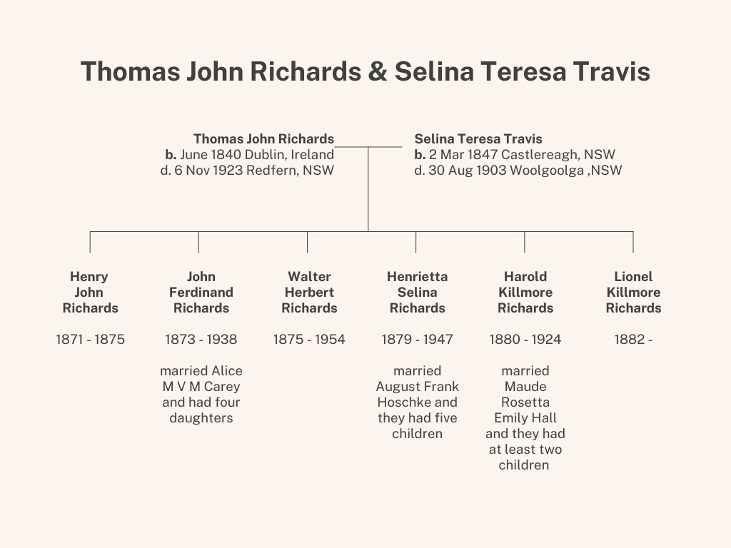 By the time he was 20, Thomas John Richards was living in Sydney, New South Wales and he married Selina Teresa Travis on 11 March 1870. Selina was 23 and she had been born in the Sydney suburb of Castlereagh in 1847