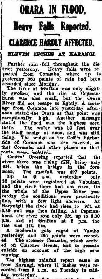 1927 – Orara River Overflows: Several Bridges Submerged 13.4 inches ( 344mm)