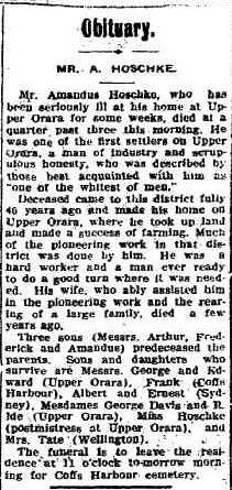 “The late Mrs. Hoschke, was one of the first women to brave the privations of the Orara scrub some 57 years ago. She battled through like many other plucky bush wives, and reared a family of thirteen. She saw her family (ten of whom are still alive) grow into Australians of the best type and was generally loved and respected by her neighbours, though of late years the had been saddened by bereavement amongst her children, one son being drowned under tragic circumstances during the last big flood.” Coffs Harbour Advocate.